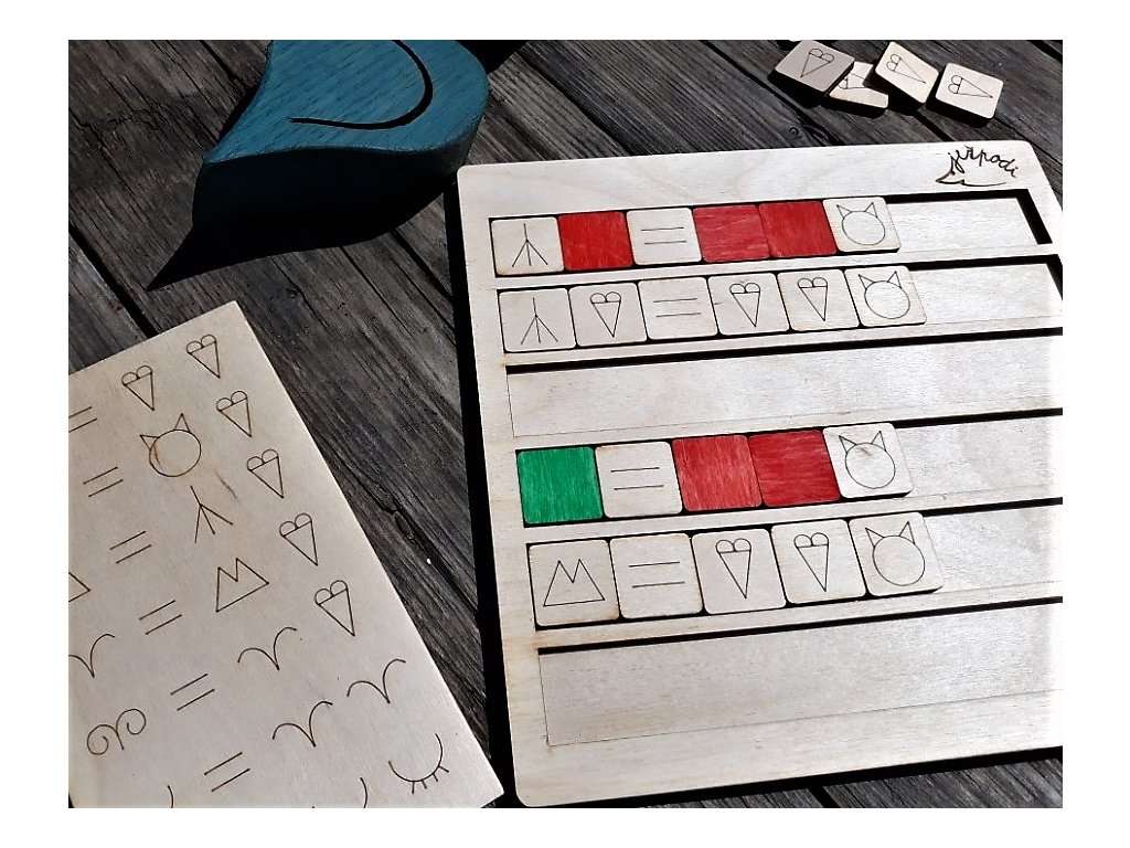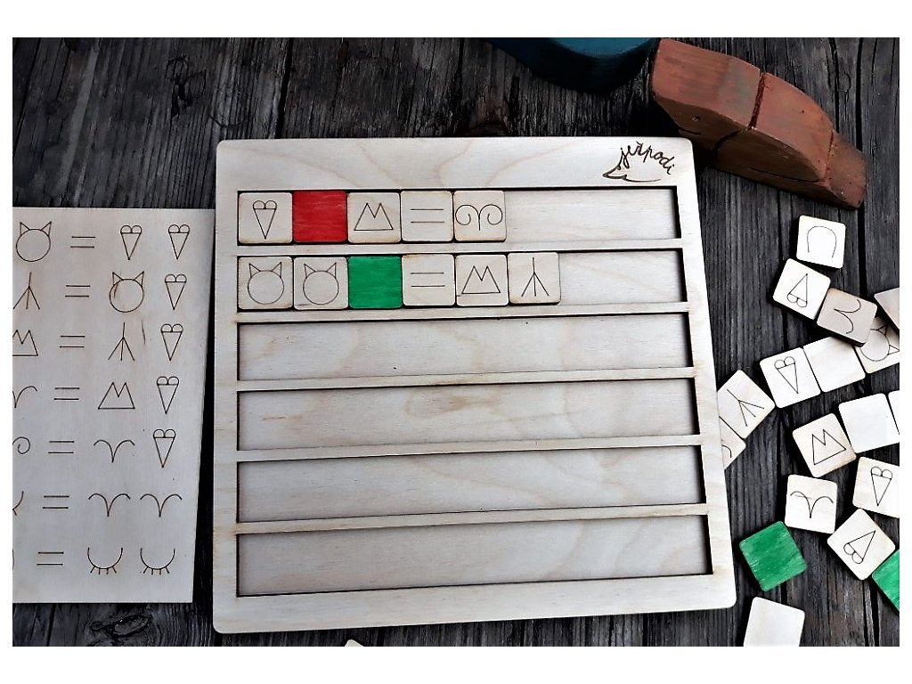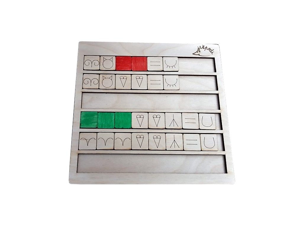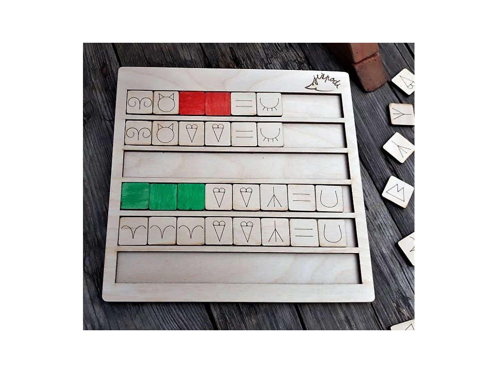 Sada obsahuje celkem 100 kusů dílků - 20x myš, 15x kočka, 10x husa, 10x pes, 8x koza, 5x beran, 5x kráva, 5x kůň, 6x =, 3x >, 3x<, 5x červený dílek, 5x zelený dílek. Dílky mají zaoblené hrany, dobře se s nimi manipuluje, jsou uložené v plátěném sáčku.