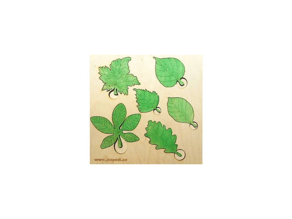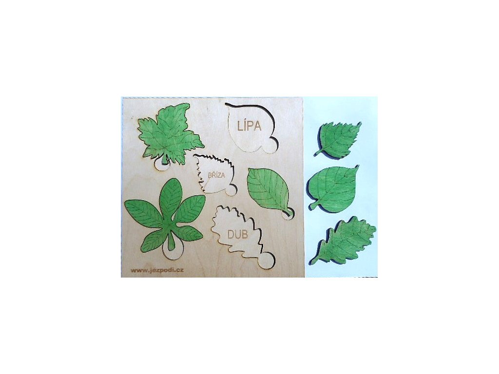 Vkládačka s vepsanými názvy stromů na podložce. Lípa, javor, dub, buk, bříza a kaštan (koňský :-)).